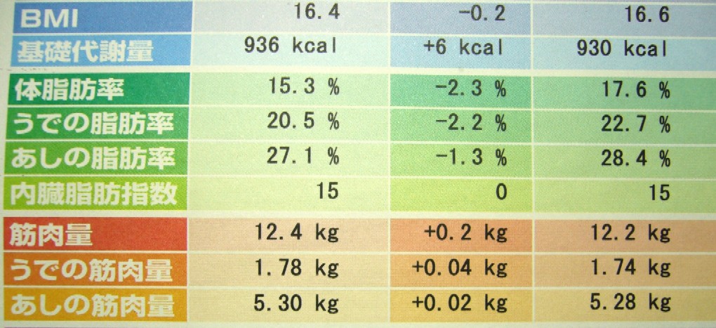 ←(左から今日の結果、前回との比較、前回1/11/06)脂肪がちょびっとずつ減って、その分筋肉になってます