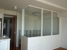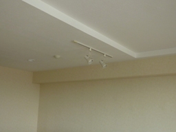 壁をベージュの石目調にしたことで、白色の備え付けの家具やカーテンボックス、カウンターなど、より引き立つ感じがします。
