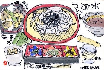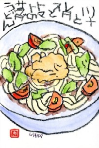 中のらんらんです。久々に食の絵手紙描きました。うどんはいつも 関西風 のお出汁ですぅ。
